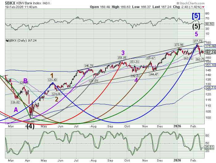 BKX may be testing Intermediate support at 169.04 this morning after declining beneath Cycle Top support at 175.18. Beneath Intermediate support the sell signal strengthens, while the 52-day Moving Average at 166.41 offers another confirmation. This is a fast moving decline with a possible panic day by mid-week.