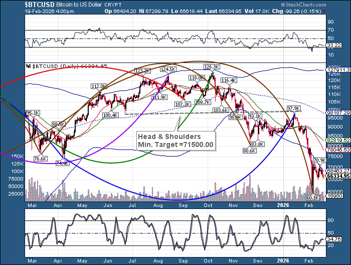 Crude oil has dipped below 63.50 this morning, with a possible decline to its Head & Shoulders neckline near 55.50. The Cycles Model suggests a sharp decline that may trigger the Head & Shoulders formation.