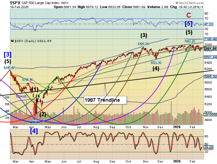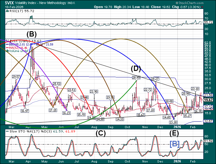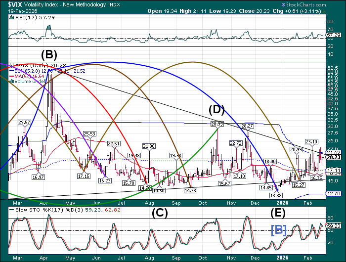The premarket VIX is holding steady above the mid-Cycle support at 17.20. The Cycles Model suggests a rising VIX with a possible breakout by early next week. The Cycles Model shows the next 6 weeks to be complex, with the first possible peak at the end of February.