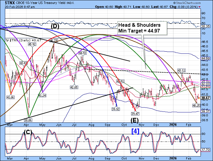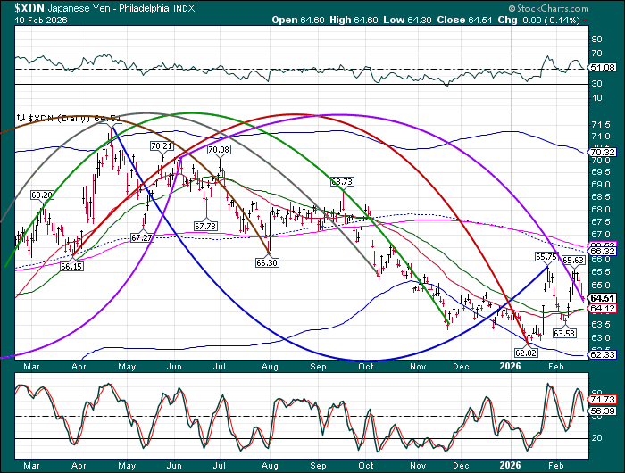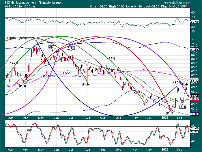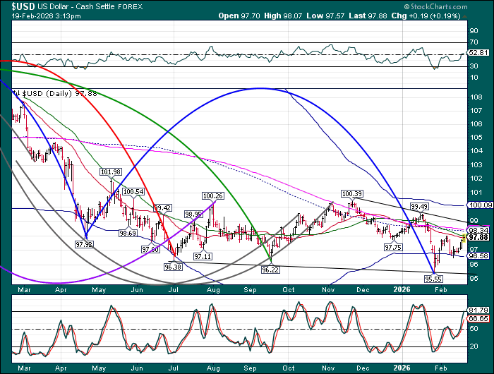 USD may finish its correction beneath the Cycle Bottom at 96.65 with a probe lower in the next couple of days. The Cycles Model suggests a mighty surge out of the low beginning over the weekend with the knock-on rally extending to mid-March. Dollar shorts may be squeezed, providing more fuel for the rally.