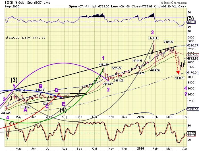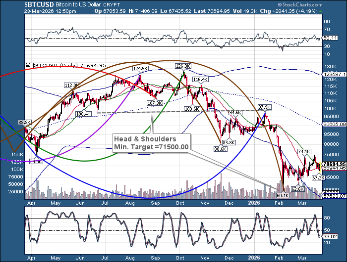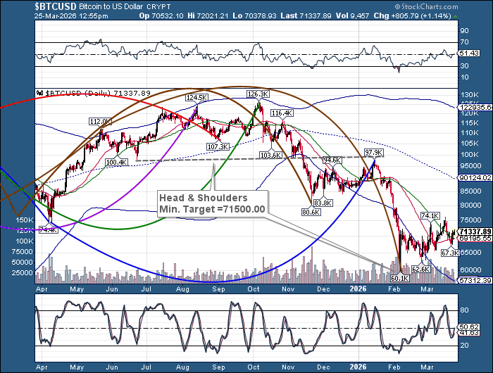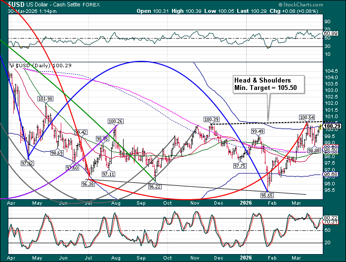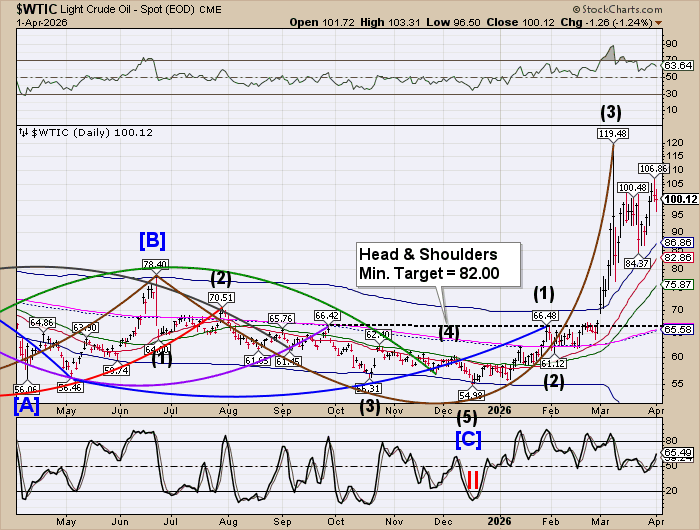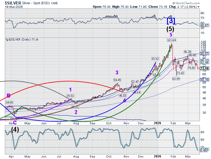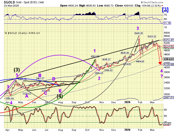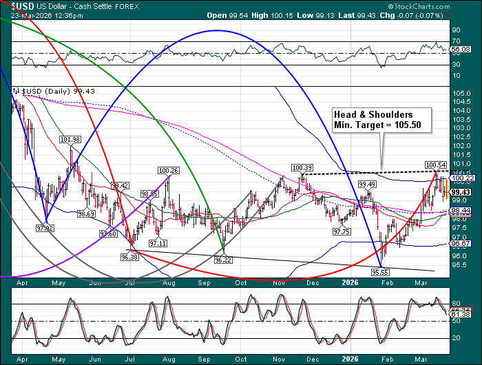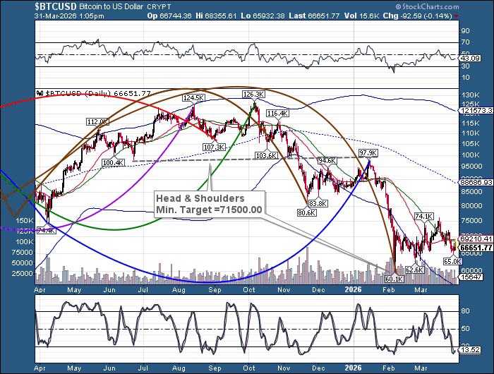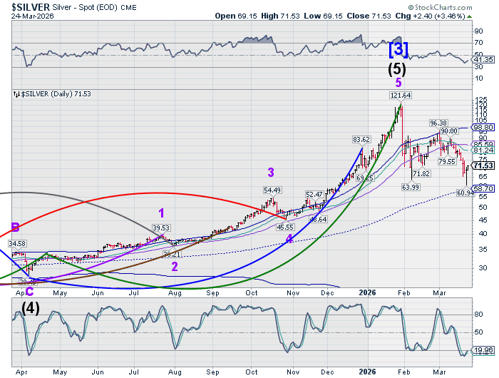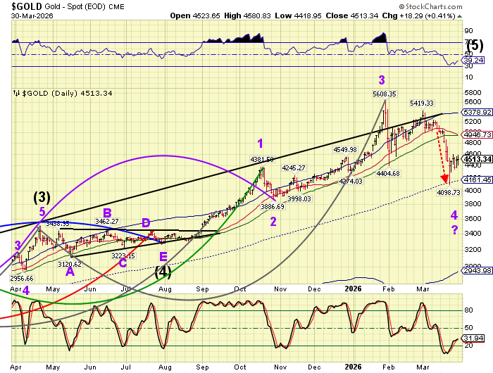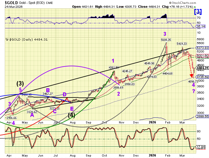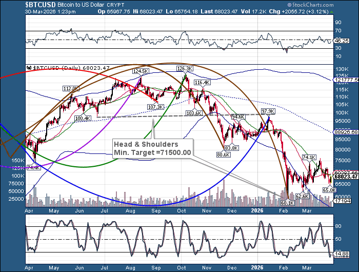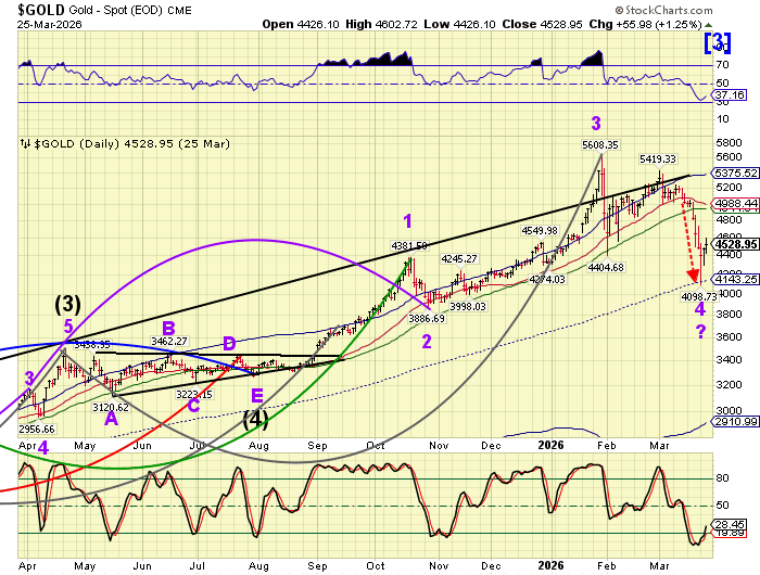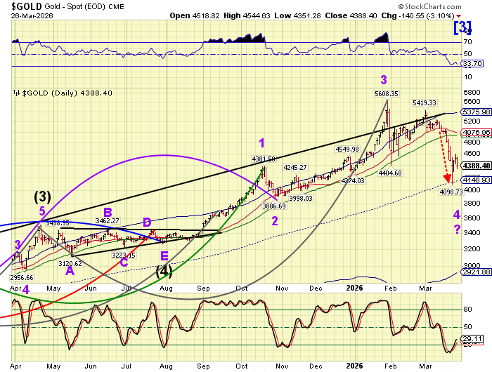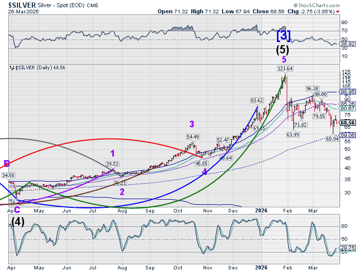 Gold declined to 4128.70 over the weekend session before starting a bounce to 4569.70. It may consolidate above the mid-Cycle support at 4124.31 for the next week or so before moving lower. The intermediate Cycles suggests that, once gold declines beneath 4000.00, it may plummet as low as 3150.00.