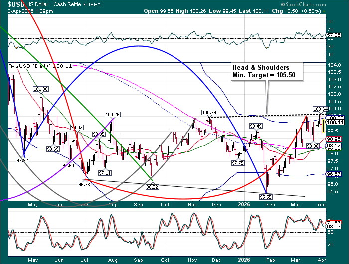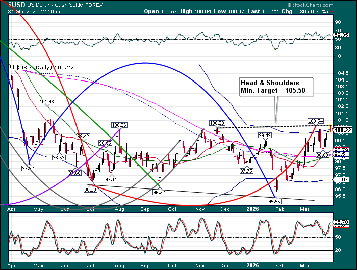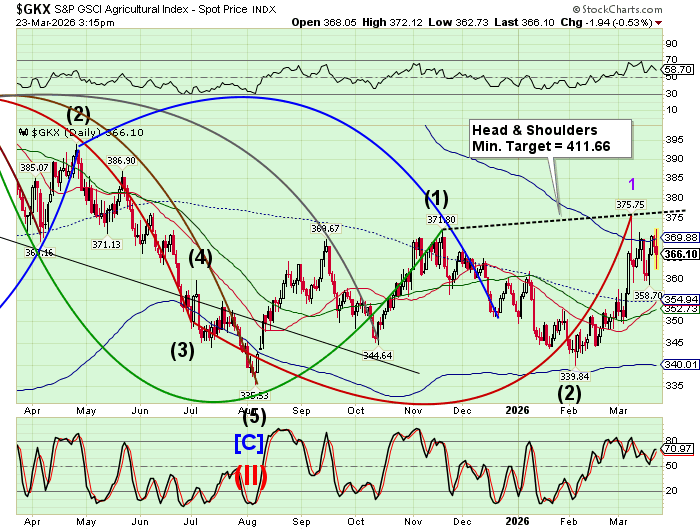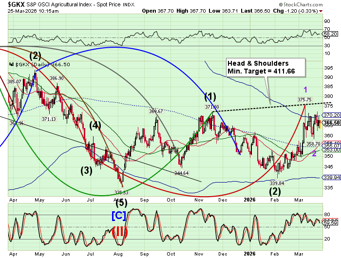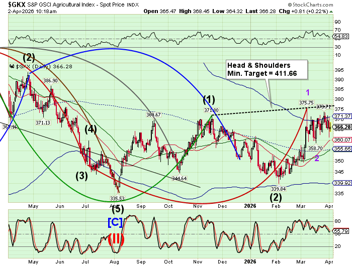 The Agricultural Index stands poised for a breakout, both above the Cycle Top at 369.88, but also the neckline at the Head & Shoulders formation at 376.00. Should that happen, the H&S target may be reached in the next month.