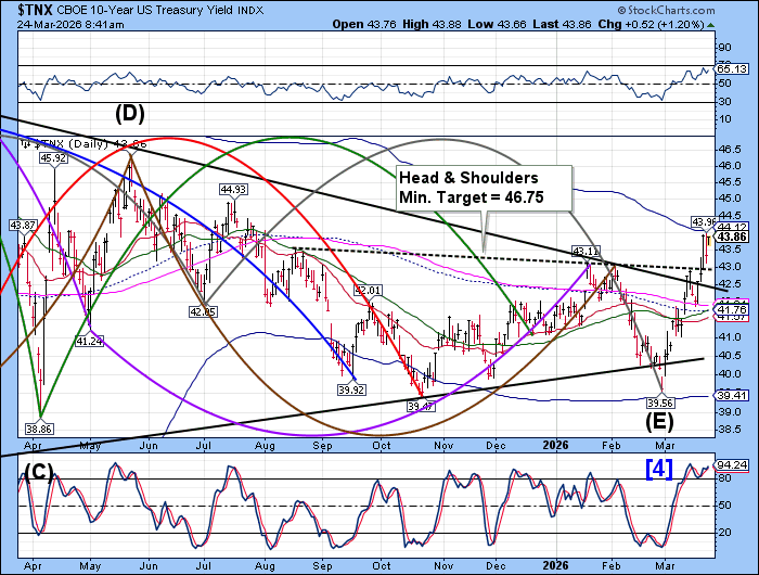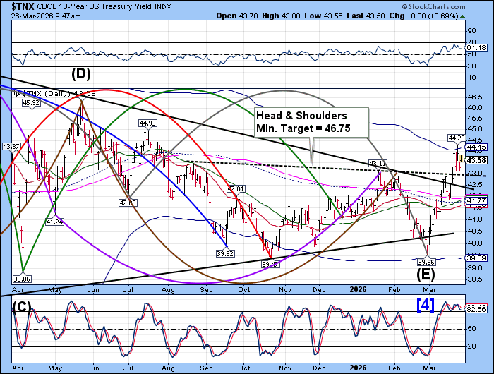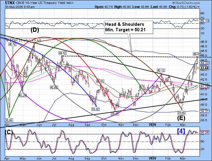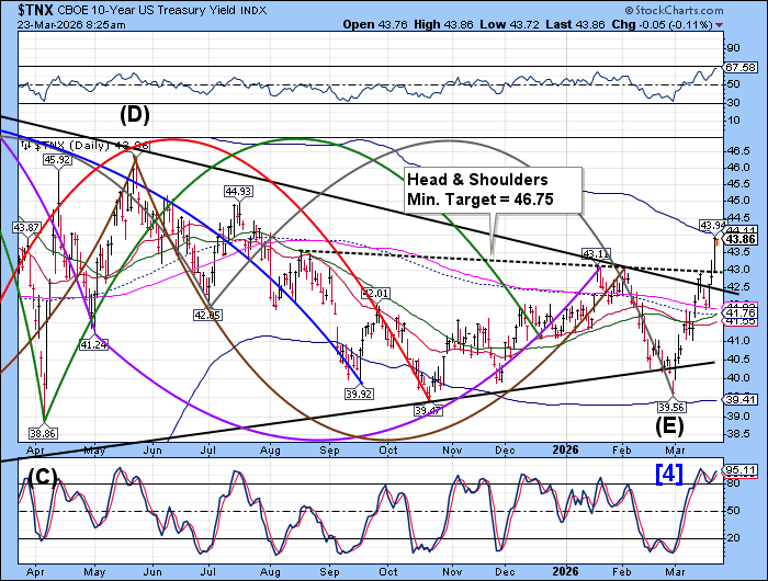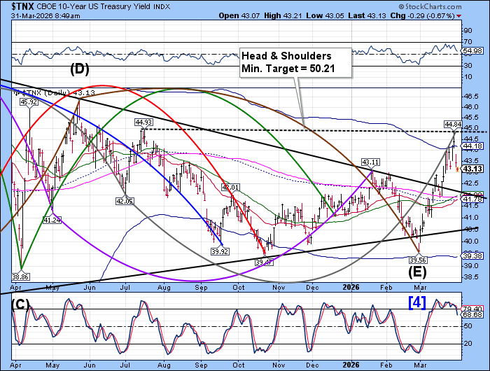 The US 10 year bond yield rose to 44.46 over the weekend before pulling back beneath the Cycle Top resistance at 44.11. The Cycles Model shows relative calm, suggesting consolidation beneath the Cycle Top for the next few days. The neckline of the Head & Shoulders formation may act as a support.