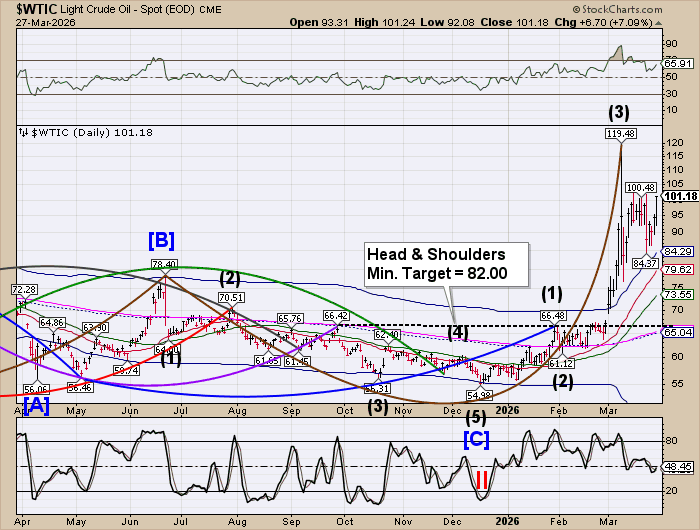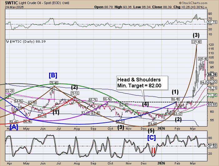Crude oil prices fell to 84.59 this morning, after reaching 101.66 over he weekend. The retracement may decline as far as the 52-day Moving Average at 70.14 by mid-April. This may give temporary relief to our domestic markets, as the US produces most of its own oil. However, the international markets re in turmoil as, under the best of circumstances, the flow of oil may take weeks to recover.