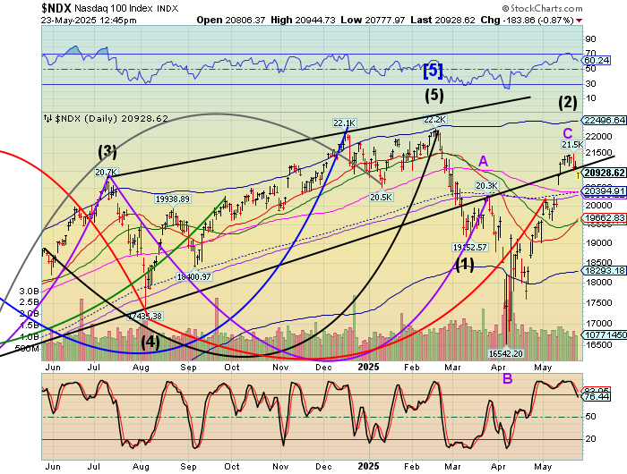 The NYSE Hi0Lo index made a modest high on Tuesday, May 20 at 159.00. Yesterday it closed at -30.00, its lowest in a month. The internals have gone negative. Normally the Memorial Day week is the high point of the Spring positive seasonality. However, the Cycles Model suggests that record may be broken as the peak may have come a week early.