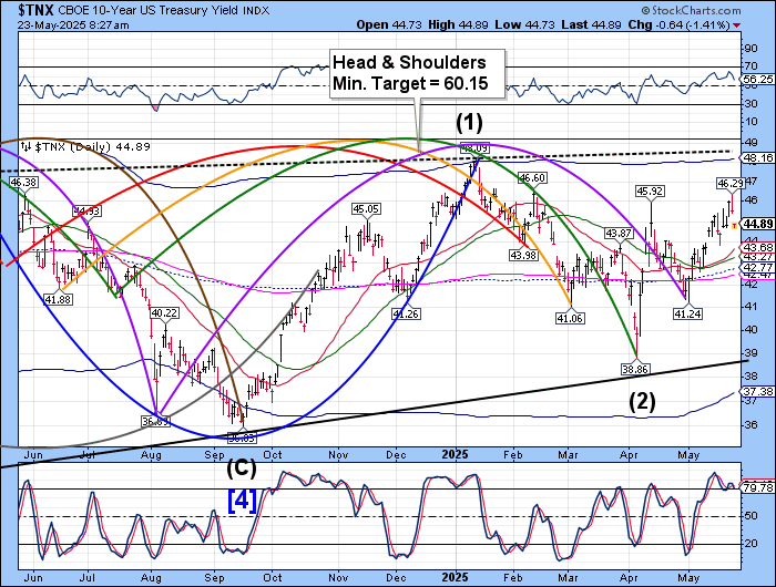 The 10-year bond futures made a temporary low at 44.45 this morning as it approaches its Cycle Top at 48.16.