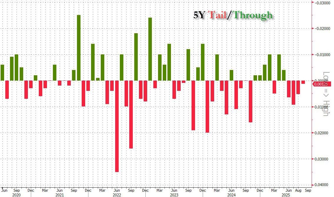 The auction stopped at a high yield of 3.710%, down from 3.724% in August and the lowest since last September. It also tailed then When Issued 3.709% by 0.1bps, the 4th consecutive tailing 5Y auction in a row.”