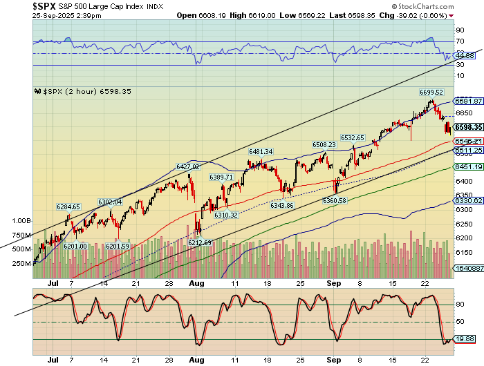 SPX futures declined to 6607.40 and may be due for a bounce. The retracement may reach 6650.00 to 6690.00, depending on current events. Fear of missing out is still strong, despite deteriorating conditions. The Cycles Model suggests a strong bounce today. However, it also infers a possible panic decline starting Friday as quarter-end rebalancing kicks in. Earnings season does not look promising as initial reports may increase downside momentum in October.