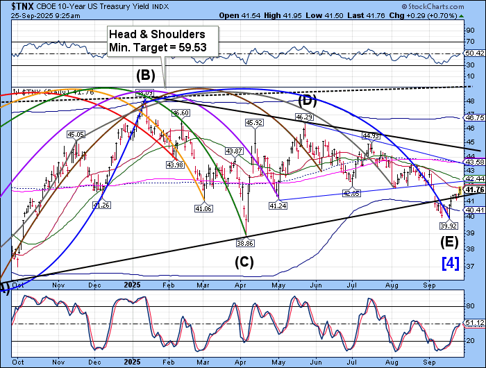 10-Year Treasury Yield futures rose to 41.97 this morning, testing intermediate resistance at 41.88 as TNX probes higher. Resistance at the 50-day Moving Average lies at 42.44. The rally may continue to the week of October 20 with a breakout possible. Q2 GDP has been revised sharply higher to 3.8%, damping the fear of an impending recession.