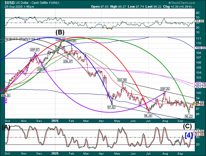 USD futures rose sharply above the 50-day Moving Average, creating a buy signal. Dollar shorts are panicking as the Cycles Model calls for a strong trending day. The trend may continue to mid-October as overseas money, especially from Europe, flees to the US>