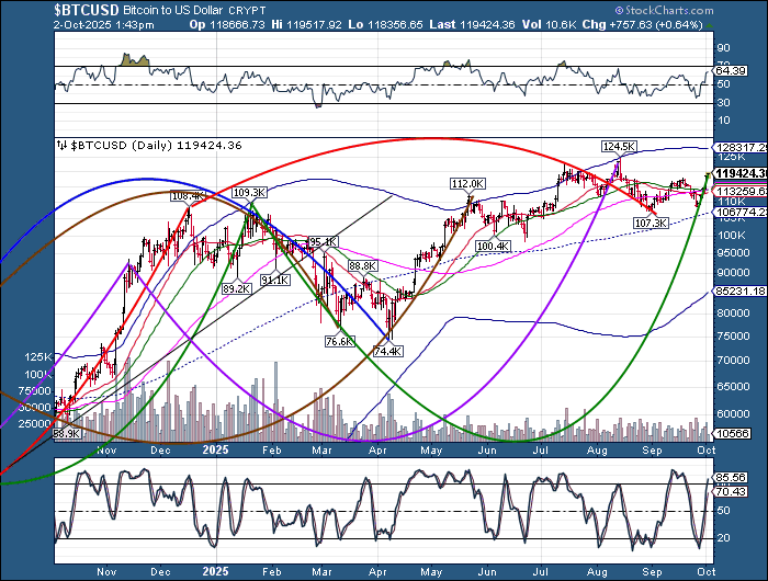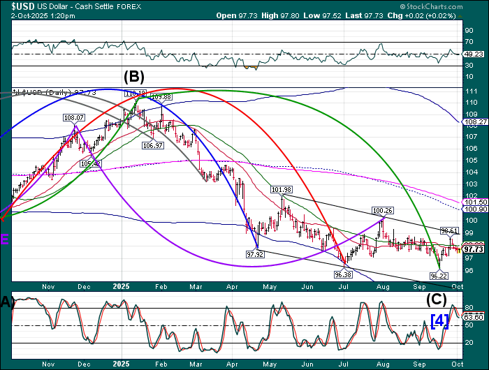 SPX futures rose to a new all-time-high at 6731.40 as it surges to its final destination. There is a high probability that resistance between 6750.00 and the Cycle Top is at 6779.70, the final bastion of resistance in the context of the Master Cycle. There are no assurances that any of the targets may be met.