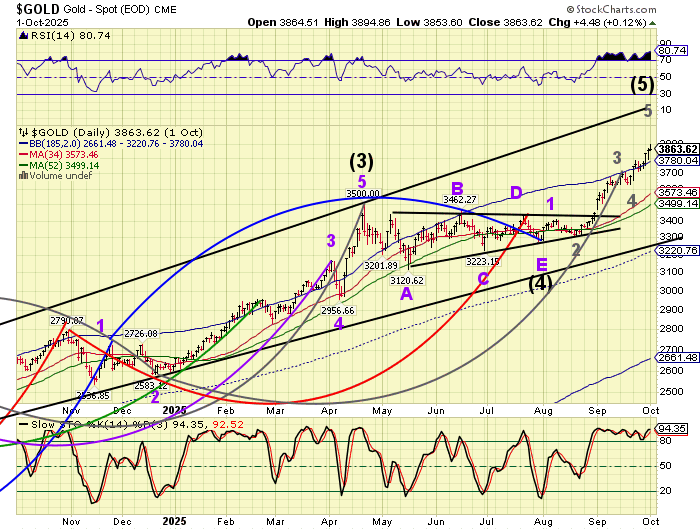 Gold futures rose another 25 points in the after-hours to 3922.80, then made a sudden and sharp reversal. There is an approximate 35 point mismatch between the futures and the CME. Watch for a possible decline beneath the Cycle Top support at 3780.04 (3814.00 in the futures), offering a possible sell signal.