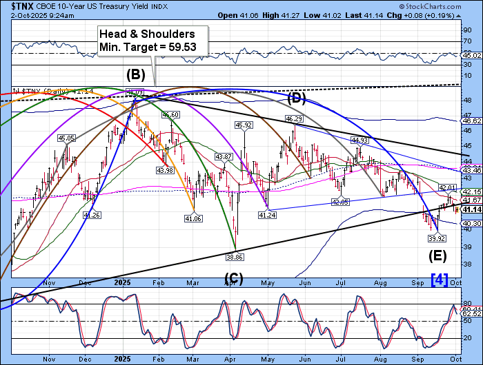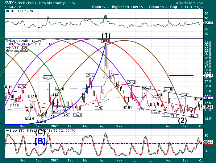 VIX futures have declined to 15.95 this morning, being supported above the 50-day Moving Average at 15.78. Should an effort to suppress the VIX in the next few days, it may produce a Master Cycle low near 12.70. This would give the VIX free rein to rally through late December. There is a mismatch between the SPX and the VIX Cycles, which portends a chaotic market through the end of the year. An alternate view is a possible Cycle Top in the next week or so, as investors panic during the next week or so..