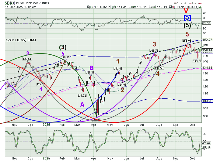BKX is testing its trendline near 151.50, making a 50% retracement. the 50-day Moving Average is at 148.58, delineating the sell signal. Volatility is rising, suggesting a possible test of the low. However, the current Master Cycle may end next week at the trendline.