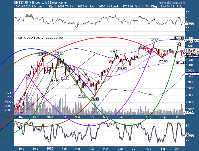 Bitcoin futures declined to 110160.00 as it approaches mid-Cycle support at 109331.00. It has cleanly broken beneath the 50-day Moving Average at 114318.00, confirming the sell signal. The decline may continue with rising volatility through early November, with a possible end to the Master Cycle in late November.