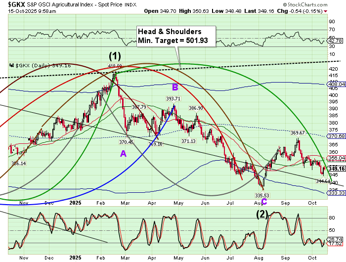 The Ag Index is approaching its Master Cycle low, due in the next week. The intended target may be the lower trendline near 340.00. This is an ideal time to accumulate shares of agricultural companies and commodities.