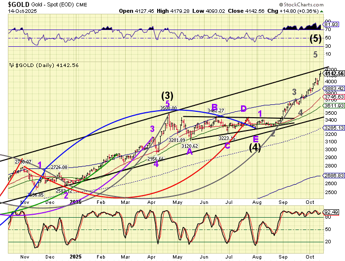 Gold futures have exceeded 4200.00 and may be due for some overbought relief as a short-term pullback is due. However, volatility may be due to return this weekend with panic buying developing in late October and early November. The initial target (above 4200.00) has been met. A throw-over (above the trendline) may develop as early as this weekend. The “gotta have it” speculators may drive the price of gold to 4500.00 or higher.