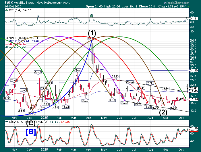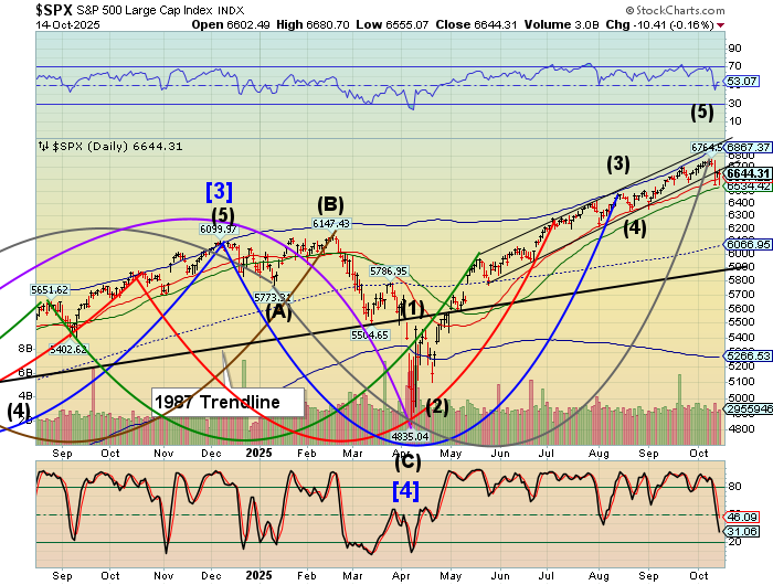 SPX futures have risen to 6691.10 this morning and and appear to be lingering nearby, threatening to rise above 6700.00. Should that take place, the probability of a new high may arise, extending the peak to early November. The rally may have broken out due to a peace agreement in the Middle East, as sentiment continues to run high in this (still) overbought market. Despite the rising risks, investors continue to be afraid of missing out. However, equities are “on the edge” of a downturn. A decline beneath 6550.00 turns the market bearish.
