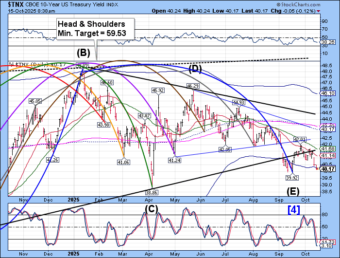 TNX continues its decline this morning with an approximate week left in the Master Cycle. It appears likely that TNX may exceed its September low, extending a roguish Wave (E). Bond volatility is due break out early next week as a precursor to a potential reversal.