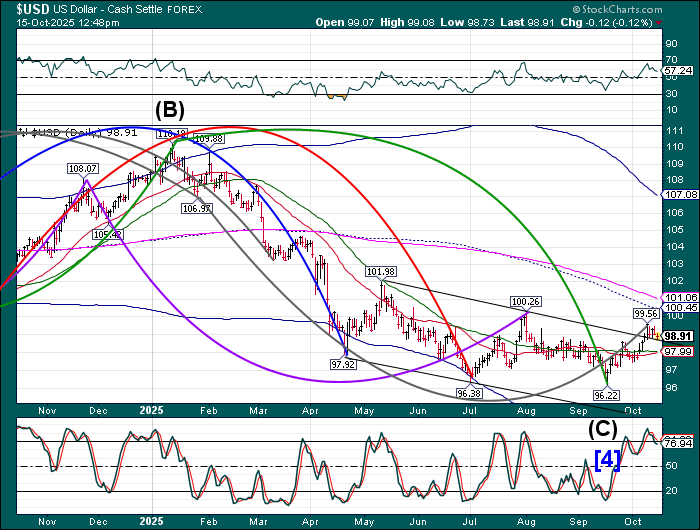 USD is hovering above its declining trendline after making a possible Master Cycle high on October 9. The Master Cycle suggests a potential disturbance in the Cycle this weekend, causing volatility to rise. Should the USD not decline beneath the 50-day Moving Average at 97.99, there may be a possible phase shift in the USD, resuming the rally.