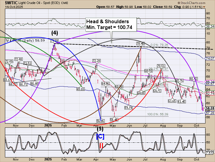 Crude oil futures dropped to 57.99 this morning, nudging the Master Cycle a little lower. Crude may be at the low and ready to begin a serious rally into the month of November. Trending strength appears again this weekend, according to the Cycles Model.