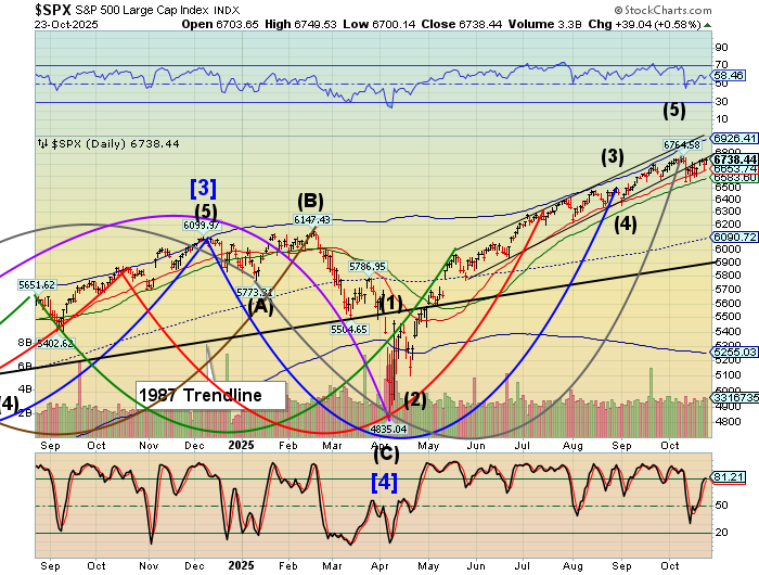 SPX futures rose to 6764.10, just ticks away from the all-time high.  There may be an even probability of a new ATH, but keep in mind that the trendline resistance is at that level.  Should a new high transpire, it may be limited and narrow, while downside risk remains elevated.  The Cycles Model shows no strong moves until the first week of November, leaving a sideways tilt until then.  This morning’s CPI print may be something to watch, as the annualized inflation rate will be calculated using these numbers.  Its impact  is being dismissed as irrelevant, but the markets seem to be skating on thin ice.