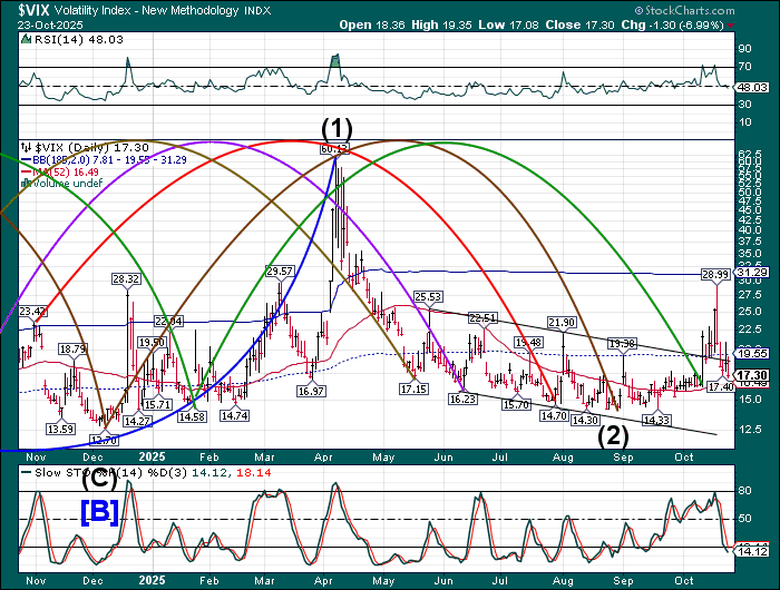 VIX futures made a marginal new low at 17.10, remaining above the 52-day Moving Average at 16.49.  The declining fractal appears complete, so  a reversal may be imminent.