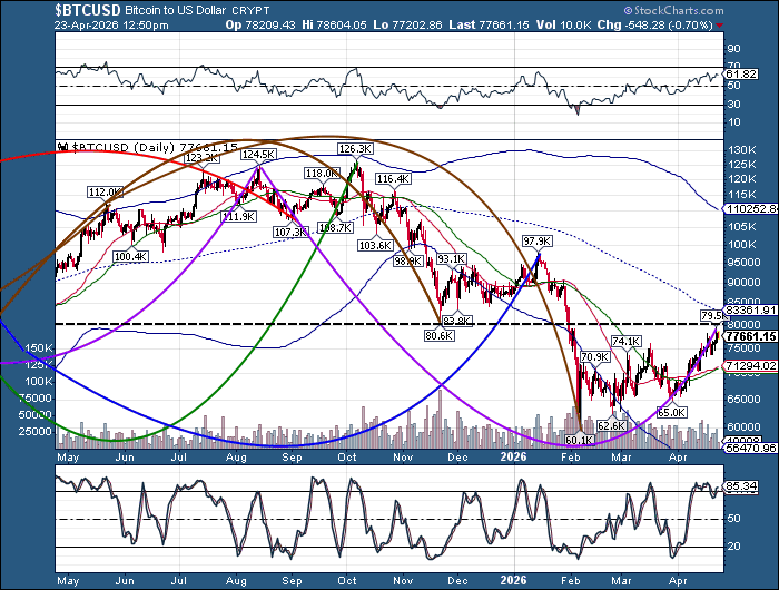 Bitcoin may have been repelled by the old Head & Shoulders neckline at 80600.00 yesterday. If so, that may be the end of the old Master Cycle and a new one begins. The new master Cycle may be due to decline to the end of June, so it may be time to liquidate longs here.