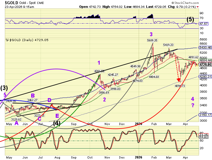 Gold is being repelled by Intermediate resistance at 4772.50 as it continues to decline. The Cycles Model suggests a potentially very large sale of gold over the weekend. The new Cycle may be very short, ending near or below 4000.00.