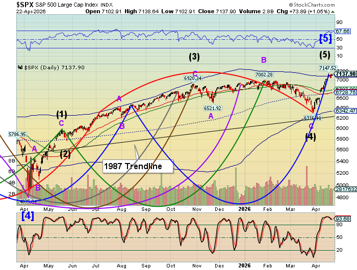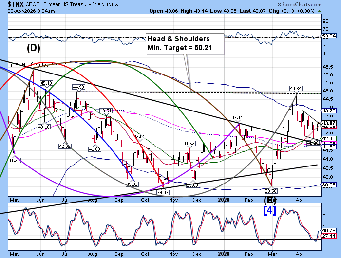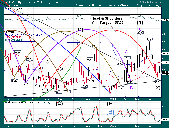 The premarket VIX rose to 20.00 in the overnight session, but may swing back to test the mid-Cycle support at 18.38 before moving higher. This may create a “slingshot” effect on the VIX as it goes into May.