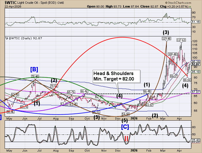 The USD has tested the 52-day Moving Average and may pull back as far as 98.00 in a corrective move. Volatility is rising, especially over the weekend and may accelerate the pullback. The Cycles Model takes a neutral stance, suggesting consolidation (sideways action) through the end of the month. A breakout appears possible in early May.