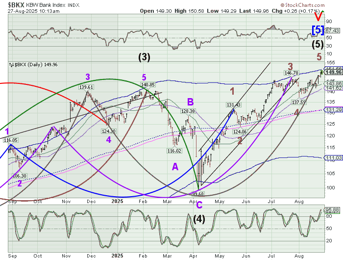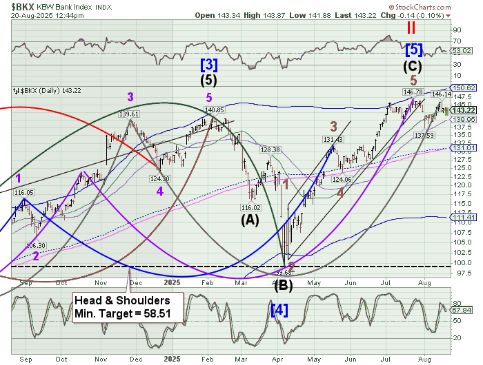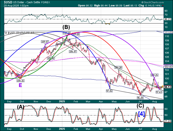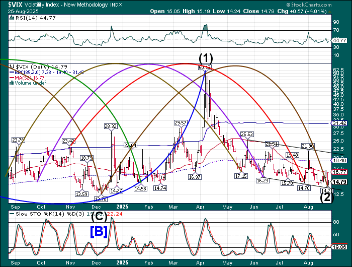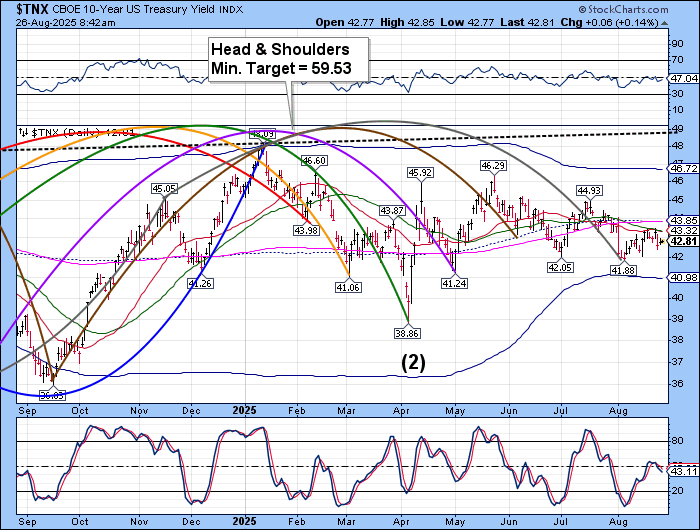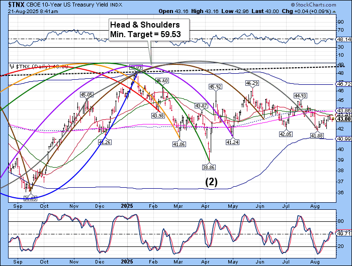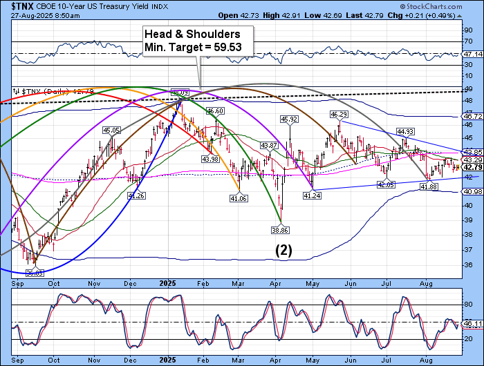 TNX has pulled back from a test of the 50-day Moving Average at 43.18. Should it break through, the next resistance may be the trendline and mid-Cycle resistance at 43.86. The Cycles Model calls for rising rates through the end of September which may be troublesome for the mortgage market.