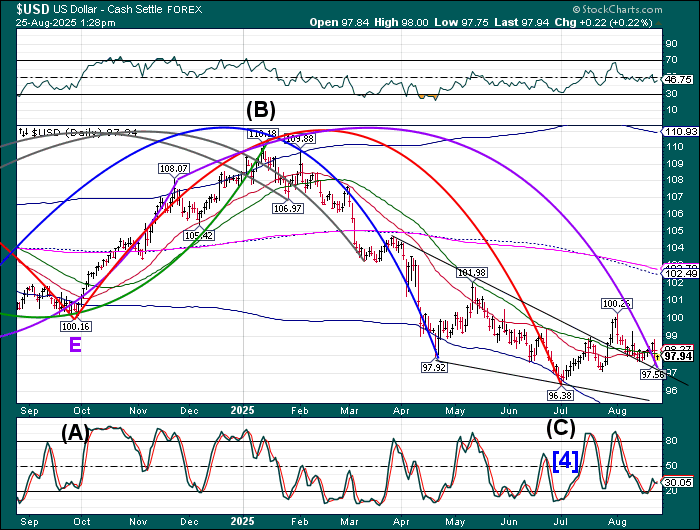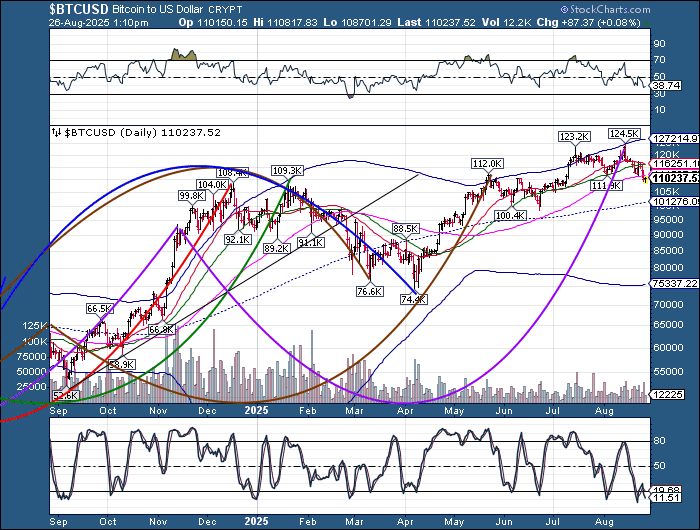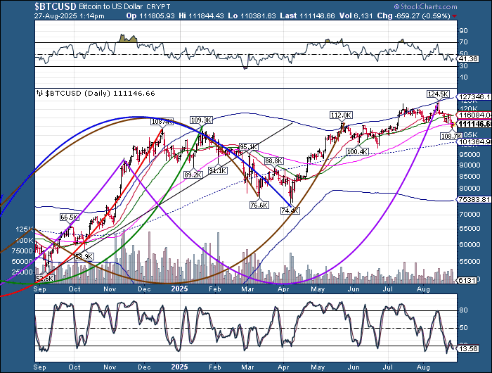 Bitcoin is consolidating near the 100-day Moving Average at 111751.00. Monday’s reversal may have marked the revival of the uptrend in Bitcoin. The Cycles Model suggests the uptrend may endure into early October.