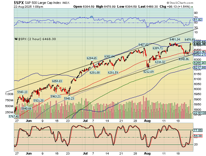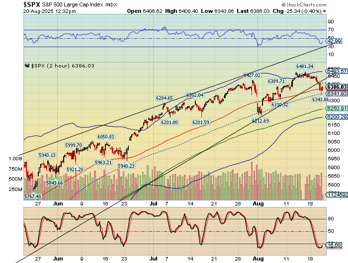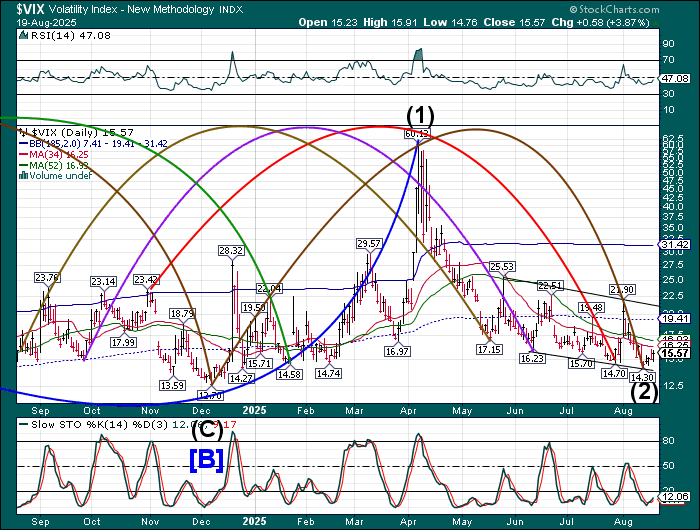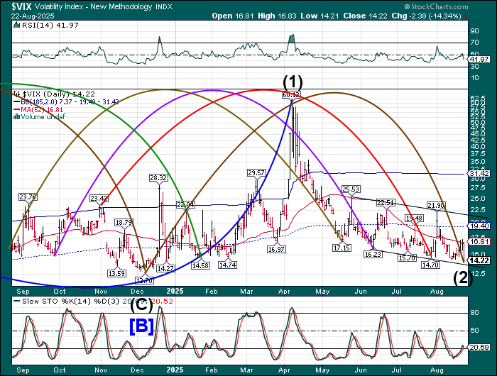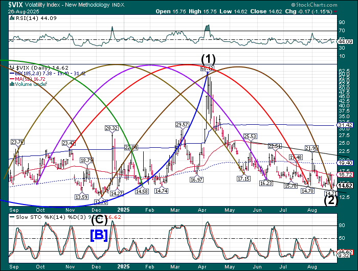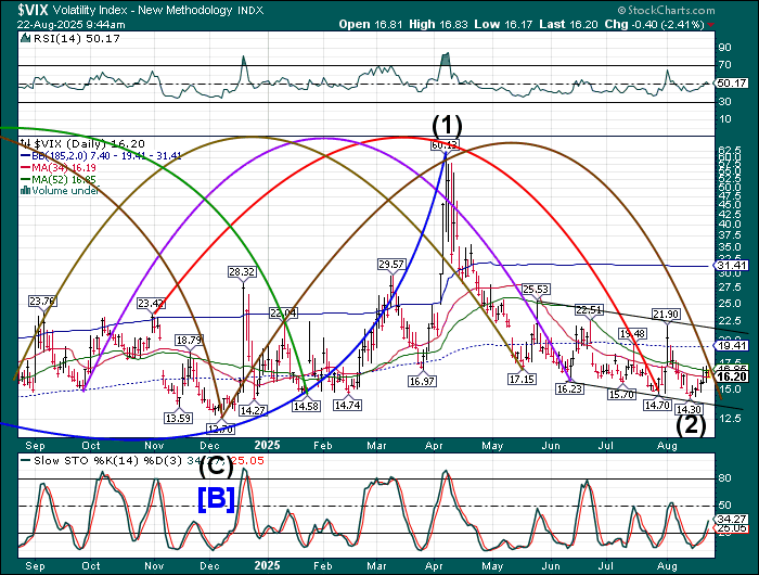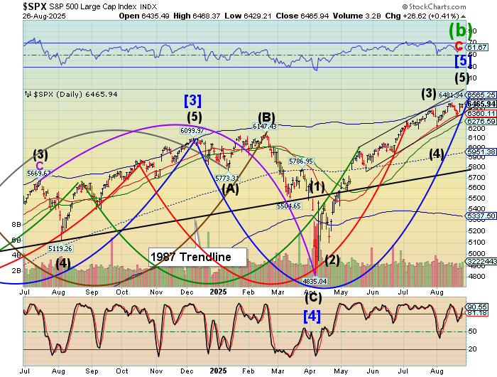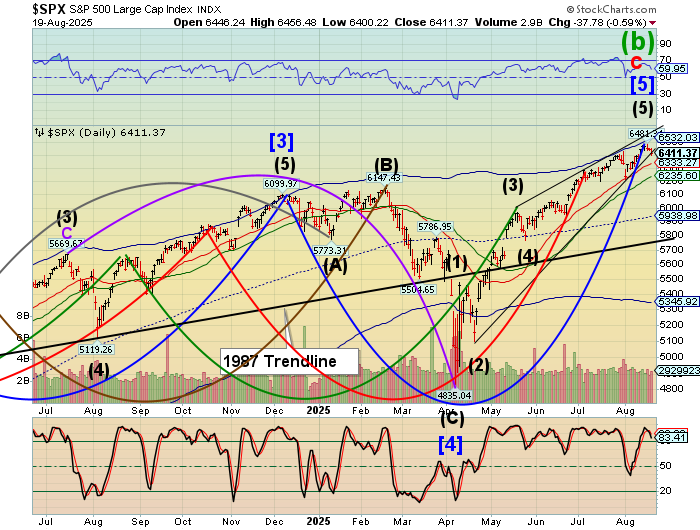 SPX futures rose to 6449.80 this morning, failing to close the gap left at Friday’s close at 6460.00. SPX may be due for a decline to test the 50-day Moving Average at 6311.81 today. What follows may be observed closely to judge the reaction to that support by the bulls. Should that support crumble, investors may be in for a wild September. The Cycles Model calls for a month-long decline that may challenge the April 7 low.