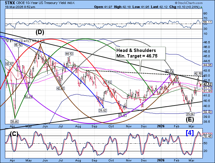 The US 10 year bond yield rose to 44.46 over the weekend before pulling back beneath the Cycle Top resistance at 44.11. The Cycles Model shows relative calm, suggesting consolidation beneath the Cycle Top for the next few days. The neckline of the Head & Shoulders formation may act as a support.